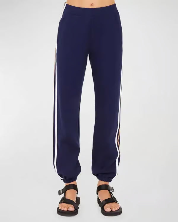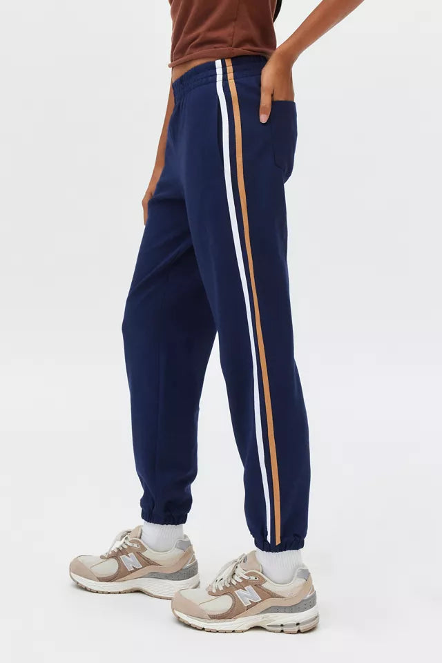 A track pant jogger by The Upside featuring dual stripes down both legs, functional back pockets, and elasticized waistband and ankle cuffs, and super soft fabric!